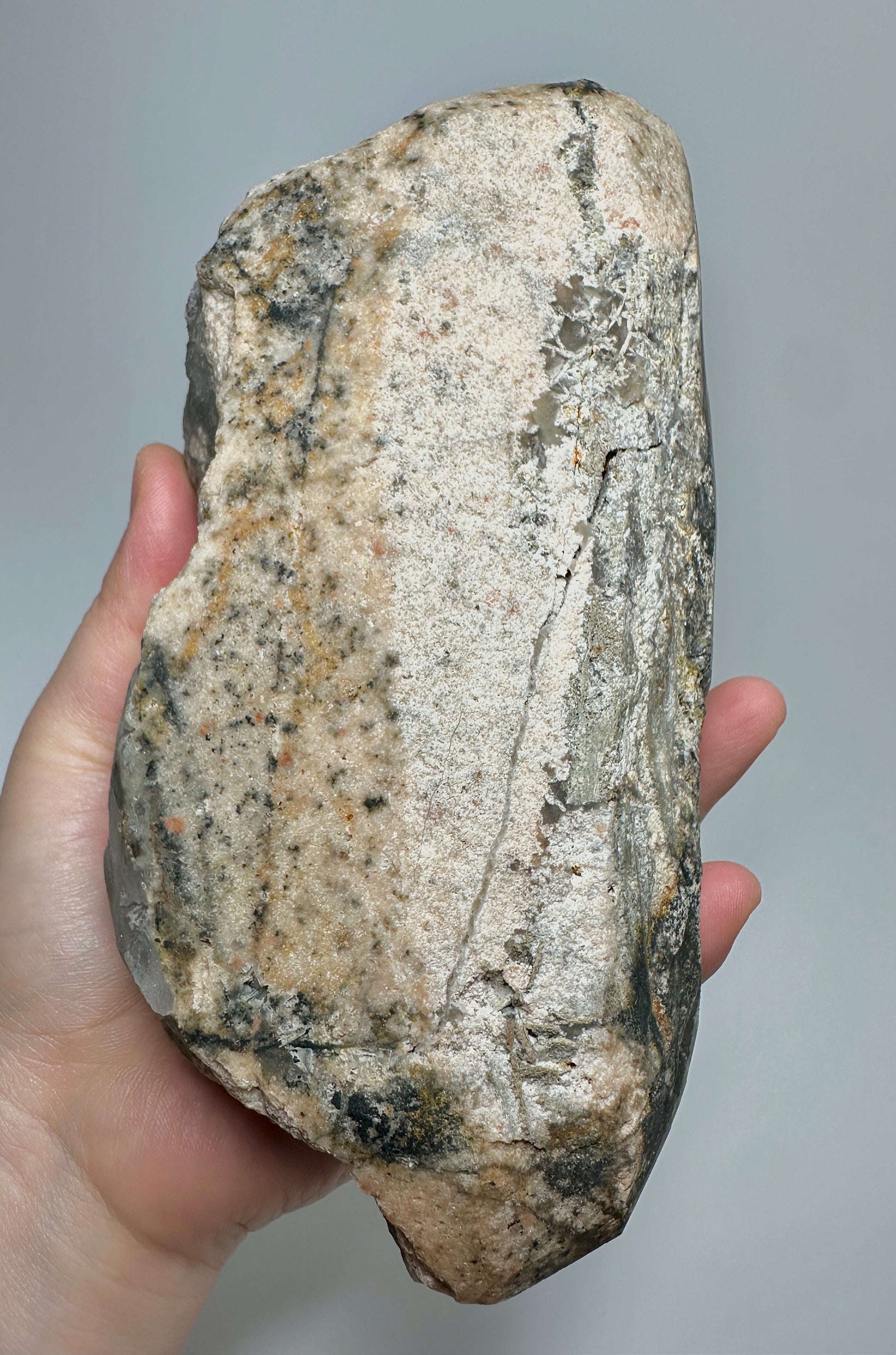 The specimen measures approximately 6.5 in x 3.4 in and weighs 1099 grams, offering a substantial and eye-catching display size. Completely natural and unpolished, this Inner Mongolia fluorite specimen showcases the raw geological beauty of natural fluorite crystal from China.